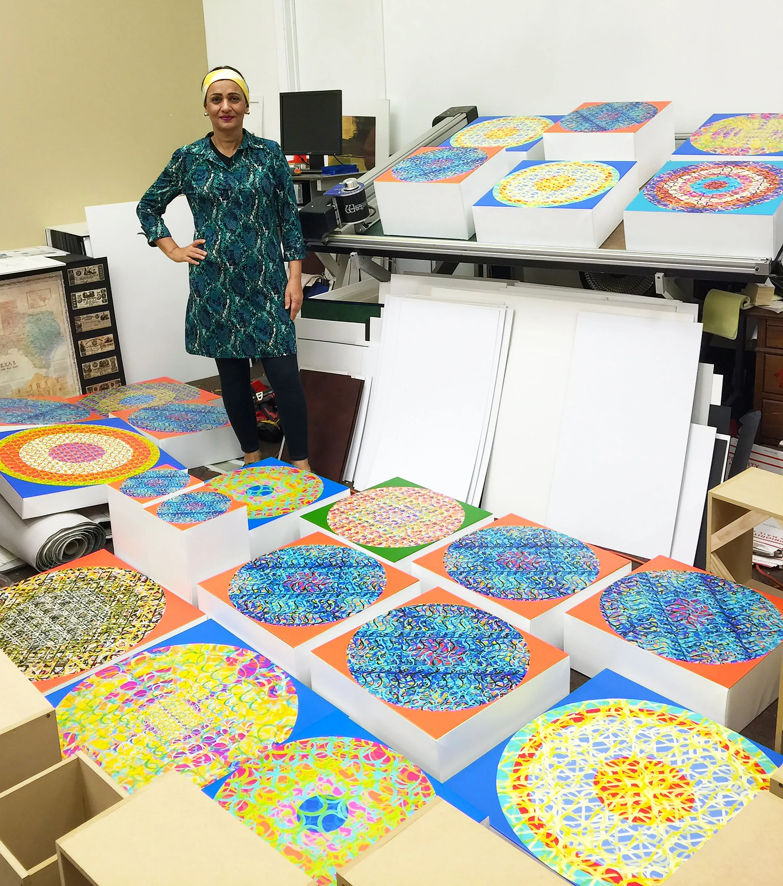 Shafaq Ahmad was born in Rawalpindi, Pakistan. After she left Pakistan Ahmad lived in the United Kingdom, Iran and Denmark before settling down in the Unit-ed States. She graduated Summa Cum Laude with a Bachelor of Fine Art degree from Virginia Commonwealth University in Richmond, Virginia in 1991 and a Master of Fine Art degree from Texas Christian University in Fort Worth, Texas in 2011. She worked as an art glass designer from 1995 to 2003 and collaborated with several art glass studios in Czech Republic and Sweden. She designed art glass for Barovier and Toso Czech Republic for 8 years. Her art glass designs are in private collections in many countries. Presently, she works as a multimedia artist. Ahmad has participated in many solo and over 70 group exhibitions in the USA, United Kingdom, Pakistan, Japan, Czech Republic, Germany, Israel, Italy and United Arab Emirates. Her work is a part of permanent collections at the Sharjah Department of Art and Culture in the United Arab Emirates, Museum of Geo-metric and Madi Art in Dallas, Texas, Mercedes Benz Daimler Financial, Corporate Headquarters in Fort Worth, Texas and other institutions. Ahmad’s work has been included in 101 Contemporary Artists, Art Voices magazine, Studio Visit maga-zine, Islamic Arts Magazine, Emel magazine, Art Now Pakistan, Dallas Art Review, Star Telegram, Libas Magazine, Valassko, Vlastivedna Revue, VAIA, bont VOOR BINNEN, and Ceramic & Glass, among other publications.